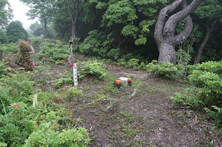 マタニ山には深谷山三等三角点(927.94m)があります(写真)。マタニを漢字で書くとこうなるわけです。ここからは下山ですが、真っ直ぐに東に延びている尾根を降りることにしました。ちょっと藪っぽい尾根です。林道に出会うことを予想していたら、まだ建設中で資材が置いてありました。その下は平坦で歩き易い尾根が延びていますが、この付近では雨が降っていて、先を急ぎました。706m地点には、轟無給電中継所の跡地がありました。この下は道がしっかりしており、奥多々良木線25に出てきました。さらに奥多々良木線26までも一直線です。こっこには森ケ谷四等三角点(658.99m)があります。問題はこの後で、どちらに降りたら良いのか分かりません。鉄塔の下に赤い「火の用心」が立っていたので、道はなかったのですが急斜面の植林を降りました。植林の下まで降りてくると、再び「火の用心」が立っていたので正解だったと思うのですが、その先では巡視路を見失ってしまい、急斜面の植林を降りるはめになりました。降りてきた所には「通称名 谷くずし」という札が立っていました。札はあっても道があるわけではなく、さらに藪を降りました。最後はミツマタの藪になりましたが、林道に出ることができました。地形図で見ると途中で林道を横切っているのですが、どこだったのか記憶にありません。