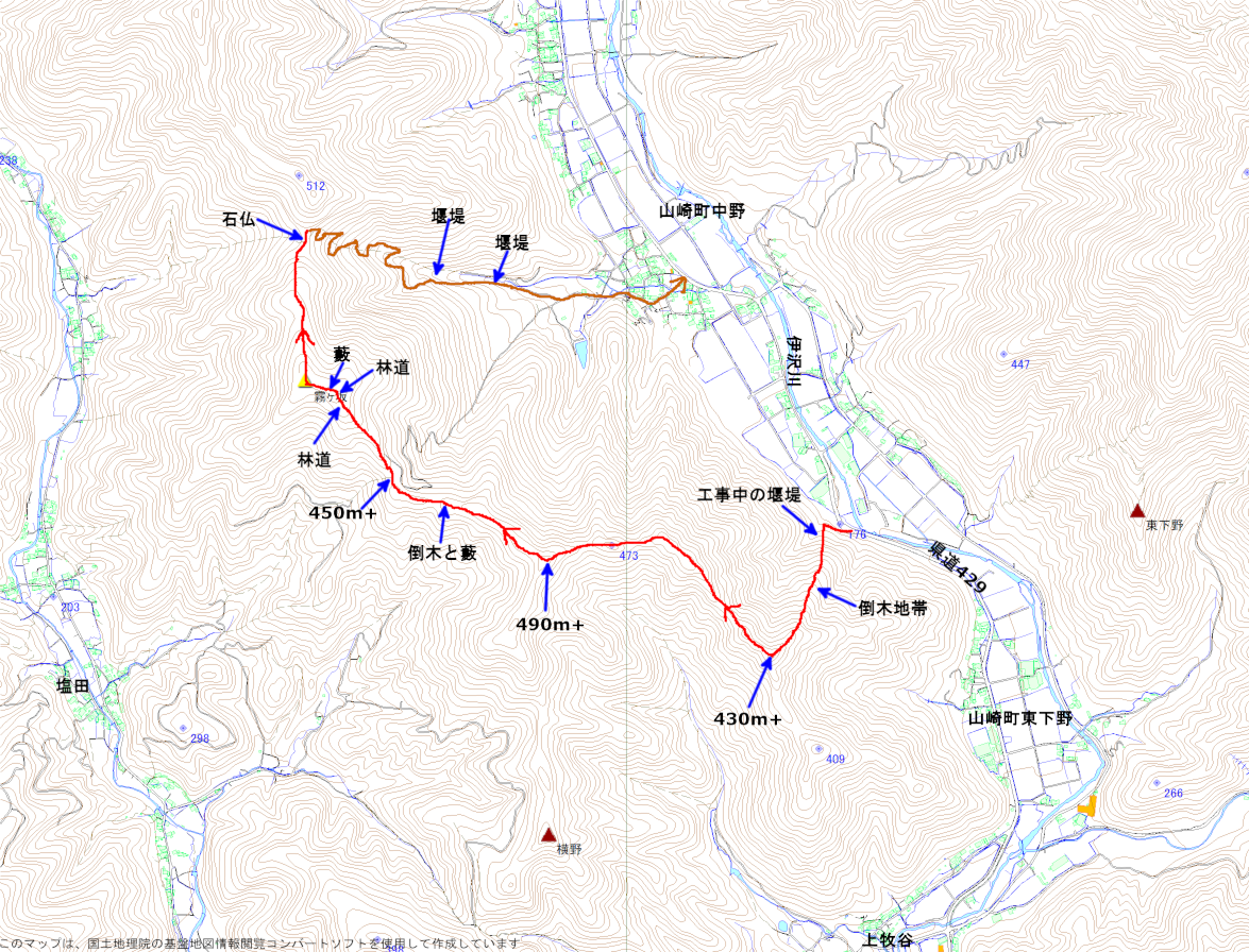 庄ノ上山からは道はありませんが北に降りました。笹を避けて降りていくと、地形図の破線道の下に林道がありました。これは2018/02/18に歩いた道です。これを北に歩きました。良い道で新緑を見ながら楽に歩けましたが、355mピークの東付近に来ると太陽光発電施設がありました。これの北を東に歩くと、「上月町杉坂峠森林浴コース」の地図がありました。現在位置が示されていないので困りましたが、ここは2019/06/16に東から来た地点です。峠のお地蔵様がありました。ここから東の植林の林道は2019/06/16に歩いています。その時と同様に326mピークの南から南東に登りました。道はありませんが問題なく登れました。途中で林道に会い、さらに340m+ピークの東では南から林道が上がってきていました。林道の終点は344m地点で、2019/06/16はここまででしたが今回はさらに東に降りました。ちょっと曲がった尾根ですが、あまり急な斜面はなく、落ち葉で滑りやすい以外は問題なく、途中からは里山らしい道も現れました。最後は北に降りて墓地に出ましたが、ここからは降りる道がなく、正解は真っすぐだったらしく、ジグザグに斜面を降りて人家の脇から道路に出られました。